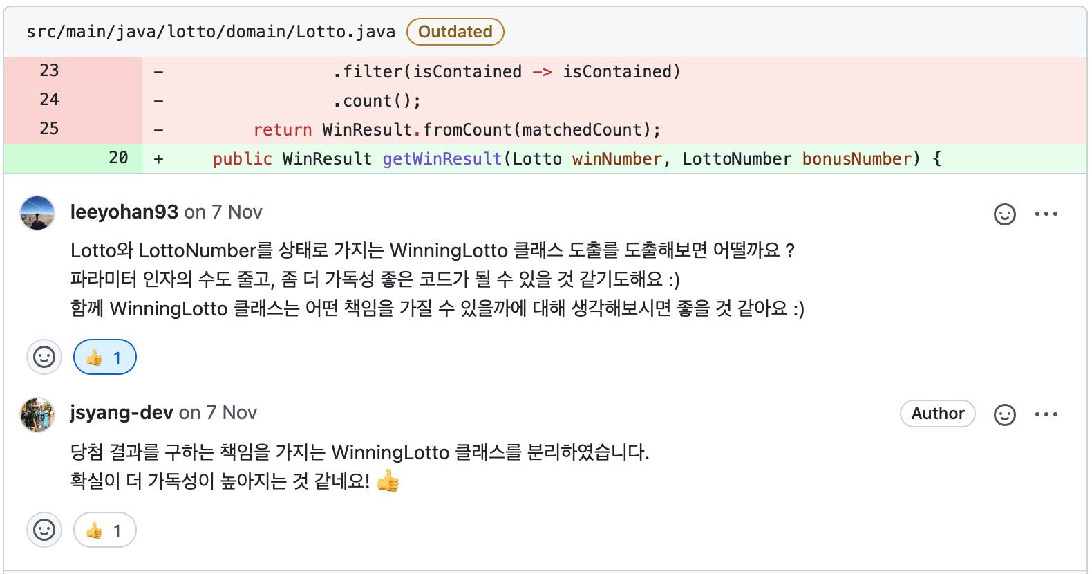 당첨 결과도 별도의 책임을 갖는 클래스로 분리해 볼 수 있다.